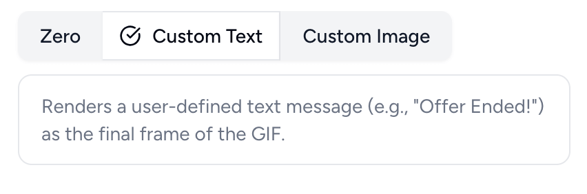Set a custom expiry state for your countdown timer. Select from a custom image (e.g., "Sold Out" graphic), zero (displays "00:00:00"), or custom text (e.g., "Offer Ended!") as the final frame.