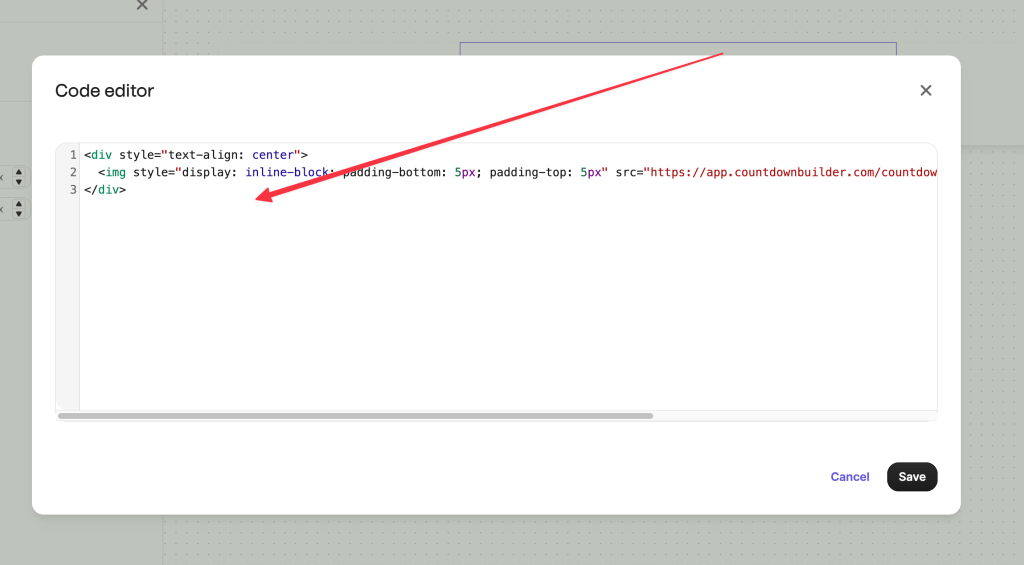 - In the code editor, paste the HTML code you copied from Countdown Builder.