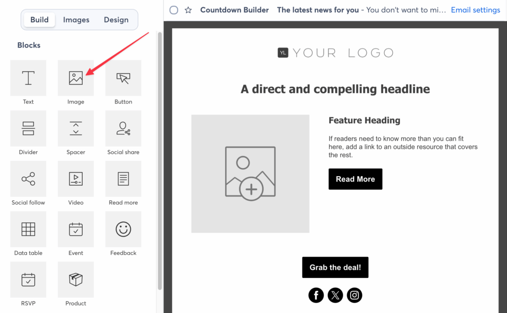 - Drag an Image block from the left sidebar to where you want the timer in your layout.